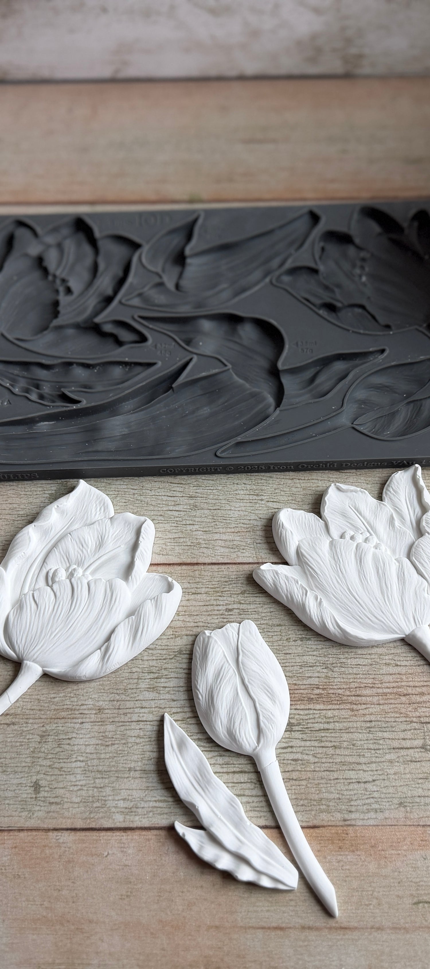 The petals have an organic sense of movement drawn from the vintage reference, and the leaves feature the detailed veining and natural curl you expect from our IOD moulds. With multiple elements, you can build so many arrangements. Imagine how darling it would be built up inside one of our arched or oval wood blanks, and how perfect it would be for Easter signage paired with our Spring Garden or Les Lapin Moulds.